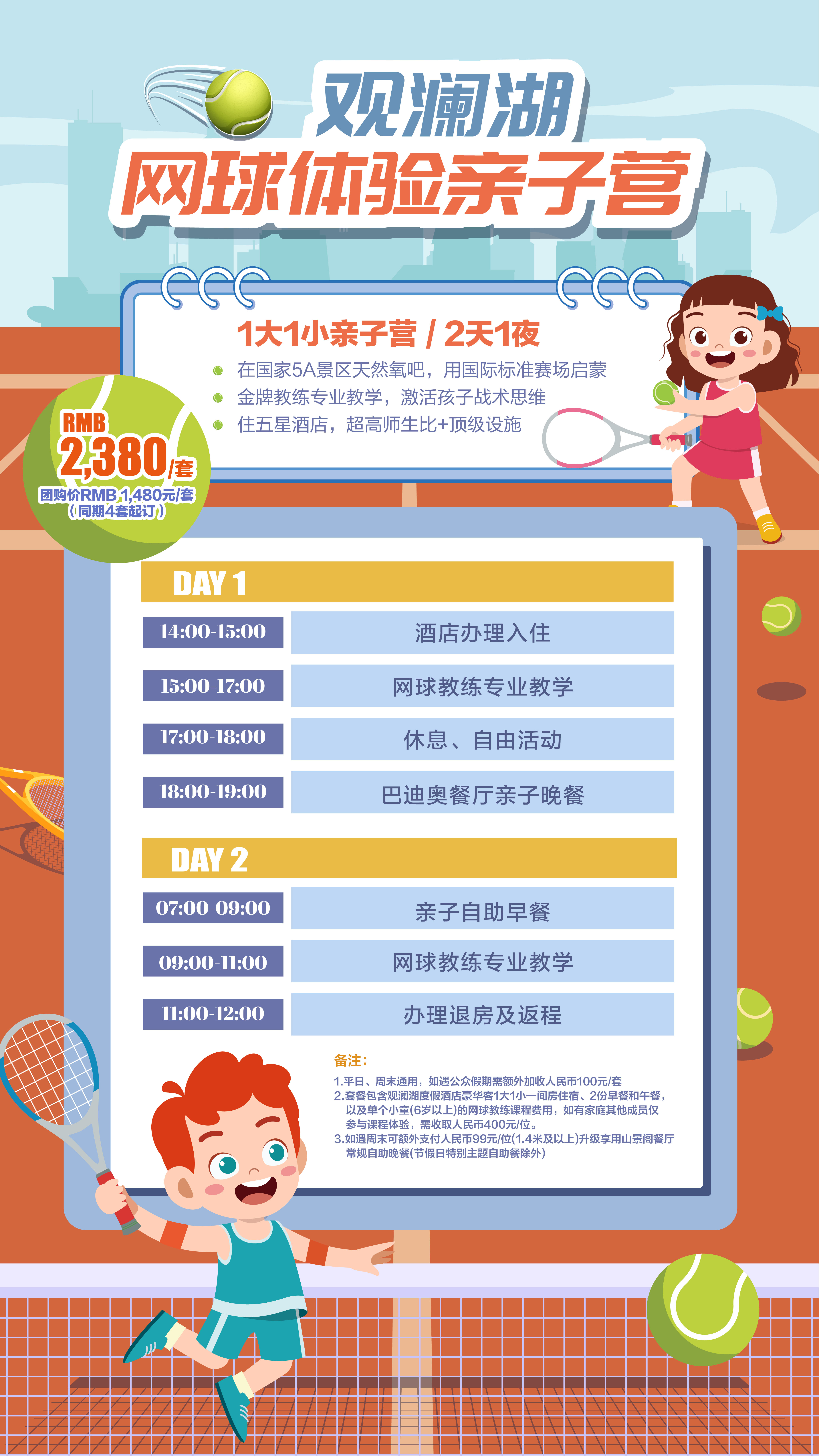 網球體驗親子營(2 天 1 夜):在國家 5A 級景區的錦標賽級別的場地上,金牌教練將帶領孩子啟蒙網球興趣,激發戰術思維;您可以與孩子組隊對壘,在揮拍間感受運動的熱血與親子協作的樂趣。