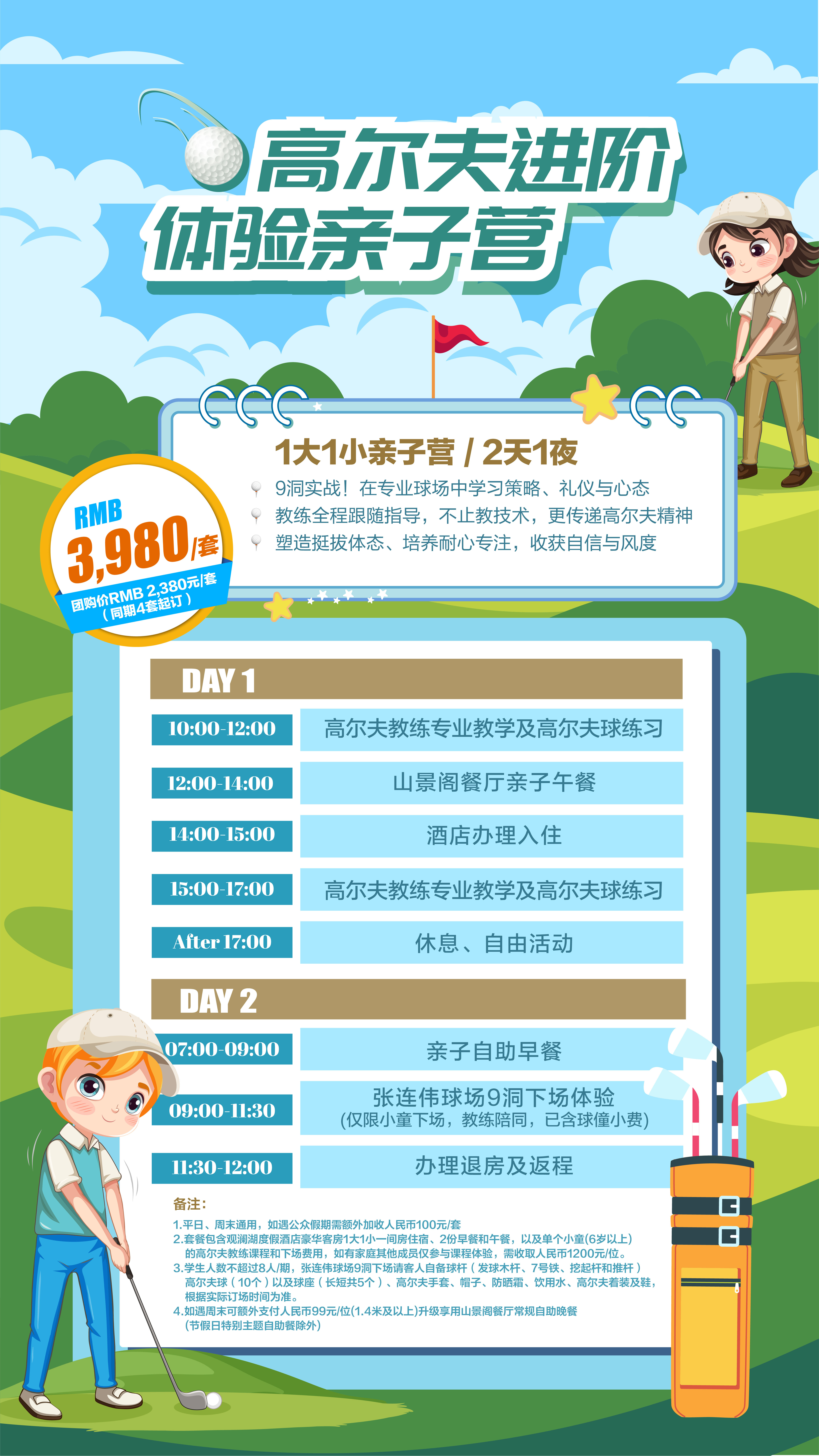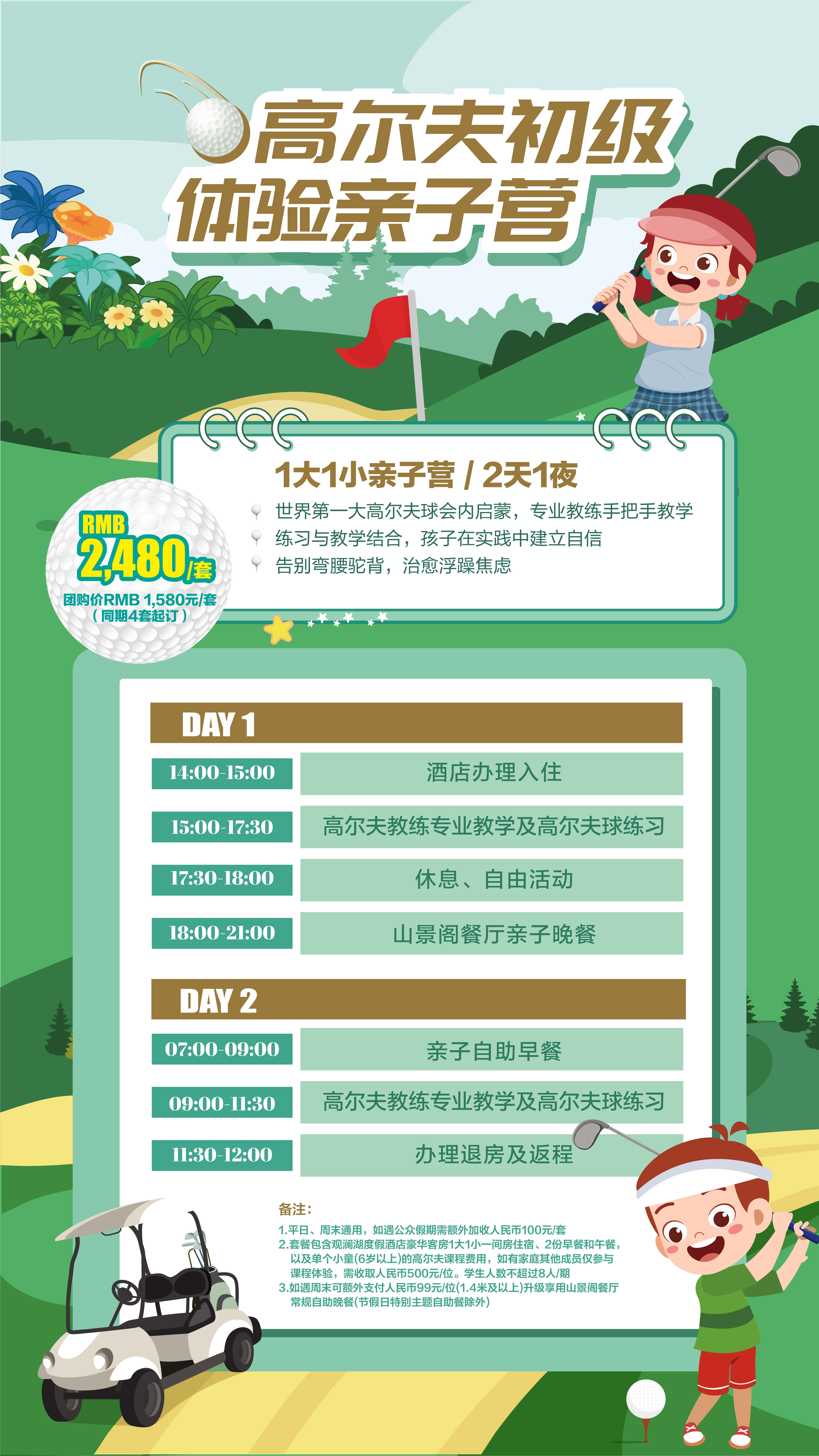 高爾夫進階體驗親子營(2 天 1 夜):適合想深入探索高爾夫魅力的家庭,不僅有專業教練傳授戰略思維與禮儀心態,更能在 9 洞實戰中領悟這項運動的精神內核,讓孩子在挑戰中收獲自信與風度。