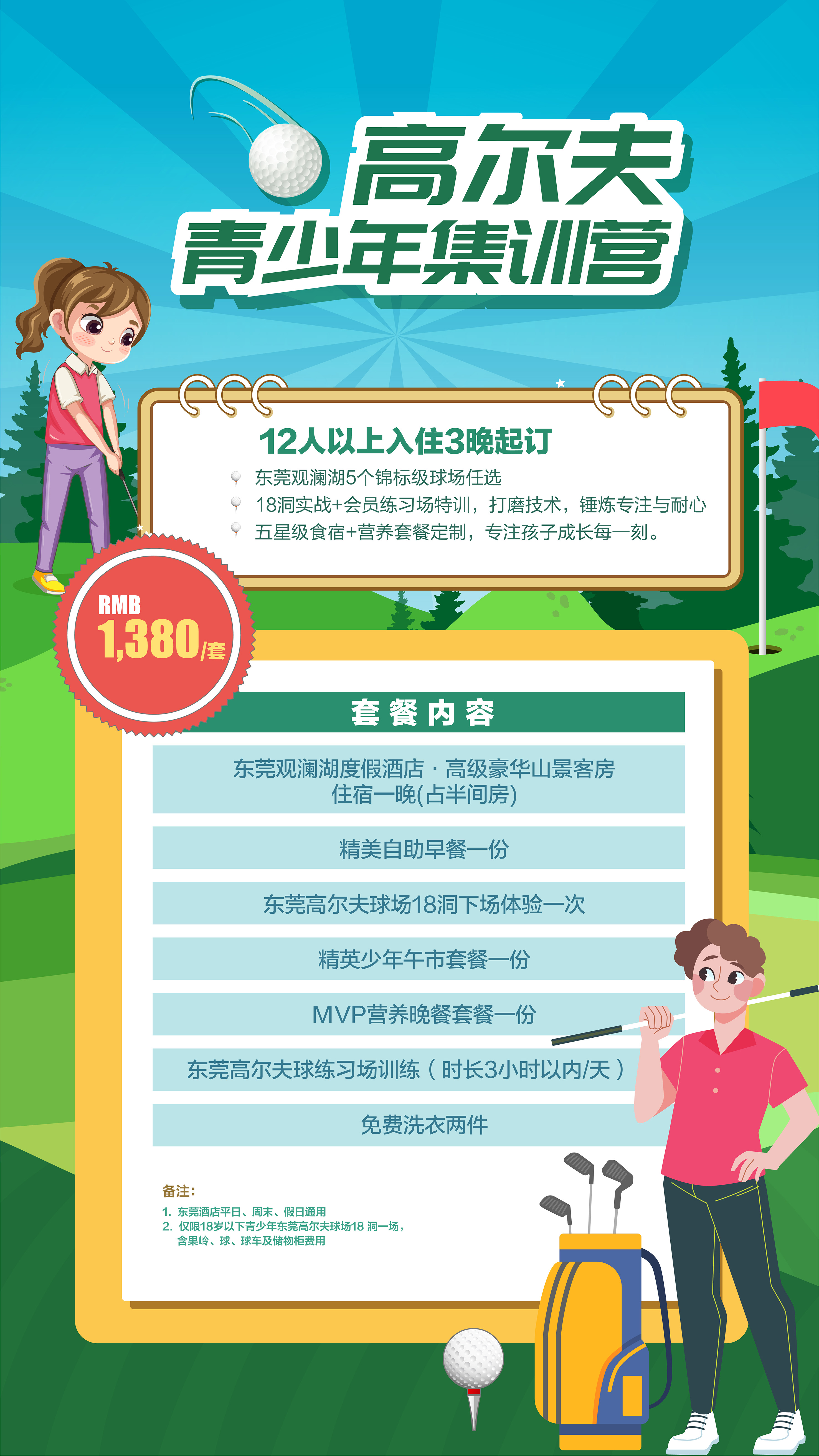 高爾夫青少年集訓營:專為 12 人以上團隊設計,18 洞實戰與密集練習相結合,讓孩子在專業氛圍中快速提升球技,結識志同道合的夥伴。