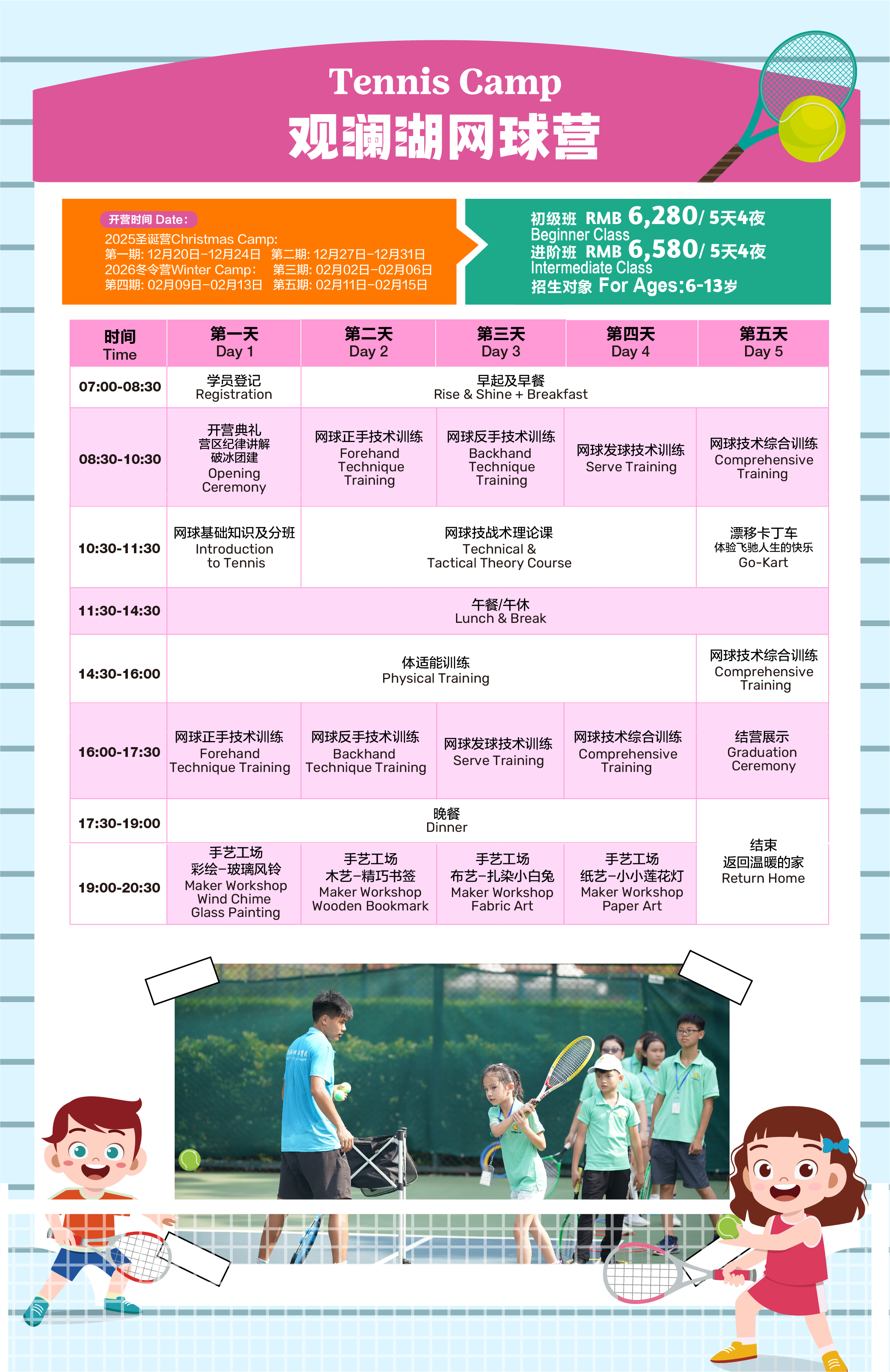- 標準國際網球場地,五星級營地設施,助力孩子衝擊網球新高度